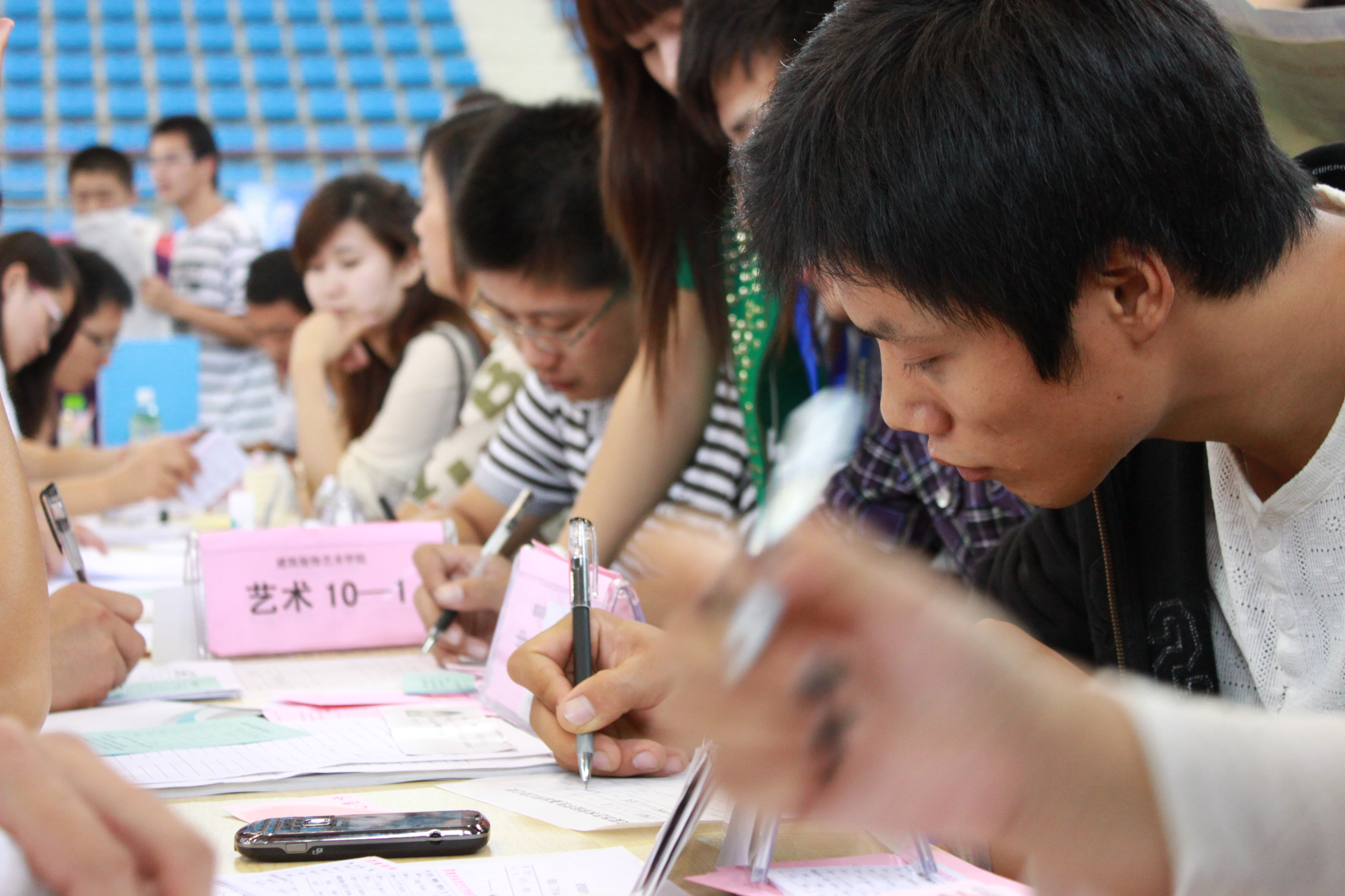 新同学在报到现场填写个人信息,
