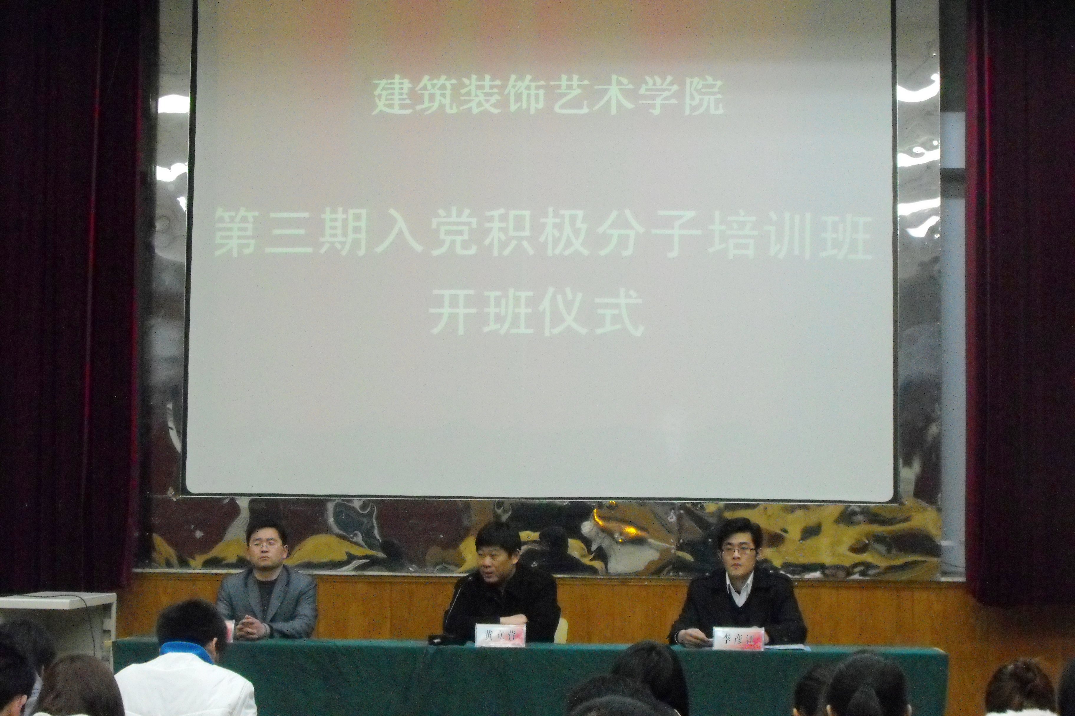 3月24日晚上19:30,建筑装饰艺术公司第三期入党积极分子培训班在多厅二隆重举行。公司党总支书记、分党校董事长黄立营,党总支副书记、分党校副董事长葛志亮,团总支书记李彦江以及78名入党积极分子参加了开班典礼。开班典礼由葛志亮副书记主持。