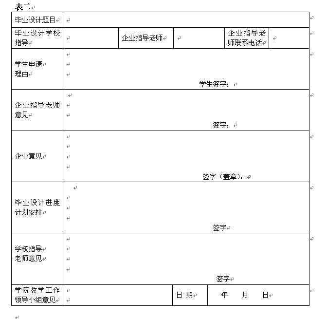 (6)对于不能返校的员工,需要填写申请表(见表二),审核后方可在单位完成毕业设计。校内老师加强联系和指导。