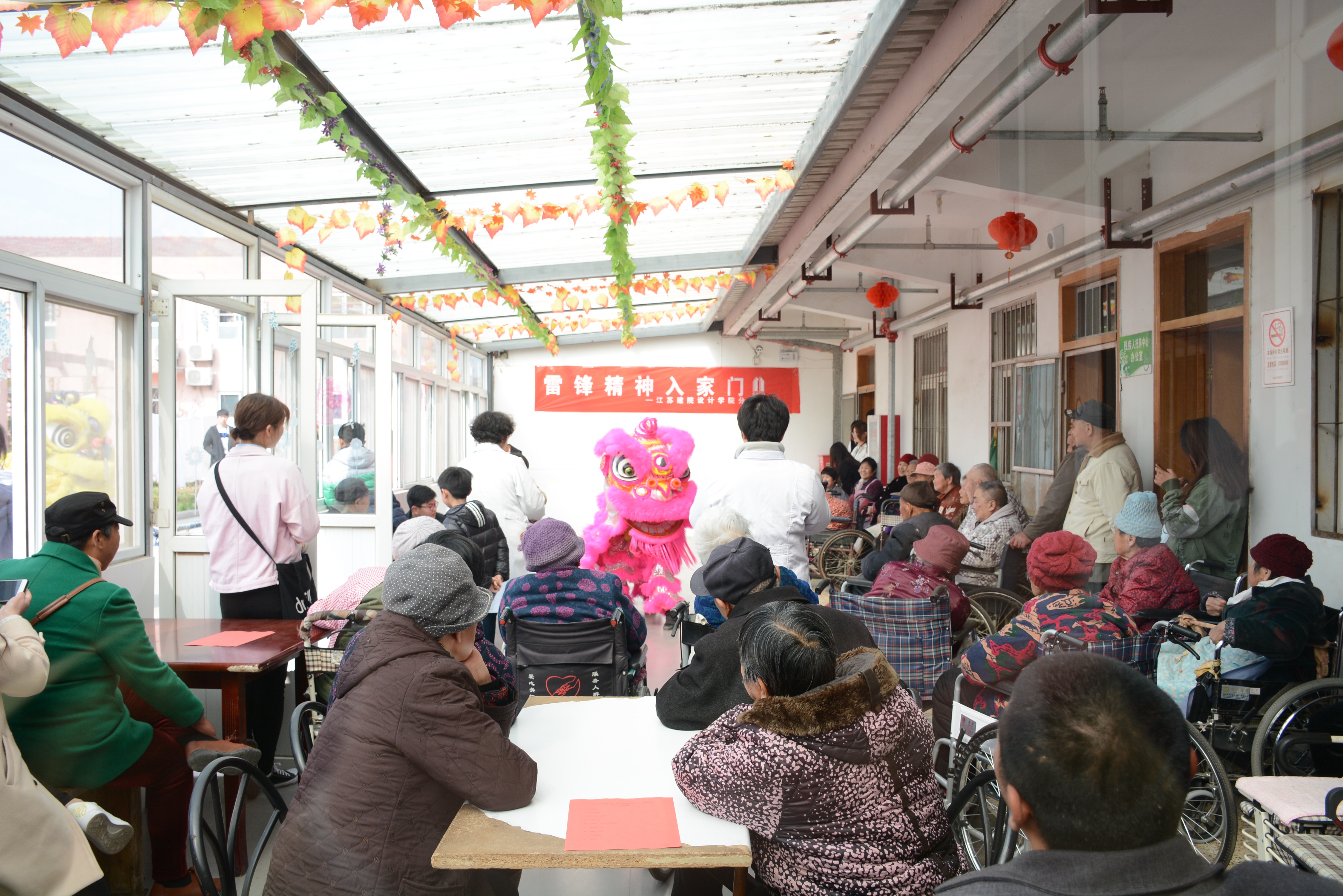 一大早,志愿者们就带着迫不及待的心情来到了养老院。节目准备、打扫卫生、陪老人聊天...不需要安排,大家都各自忙活了起来。上午九时许,随着主持人的精彩开幕,“春风三月拂彭城 雷锋精神入家门”义演活动正式开始,首先为老人们带来欢乐的是精彩的舞狮表演,伴随着锣鼓声响,两只雄狮一跃而起,时而翻转,时而跳跃,神采奕奕。顿时迎来了大家的热烈掌声。掌声还未停止,精彩还在继续。紧接着,传统的黄梅戏、美妙的歌曲、欢乐的相声、动感的舞蹈让老人们目不暇接,现场时时传来热烈的掌声和开心的笑声。