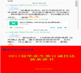 2017年4月19日至5月10日,对2017届67名助学贷款毕业生多次发送确认信息通知,及时提醒告知毕业确认的重要性及还款信息,逐一督促员工按时申请;5月31日在设计公司会议室签订诚信还款承诺书,每一位贷款同学都要做诚信还款的楷模,实现贷款时“给我一份信任,还你一个承诺”的诺言。