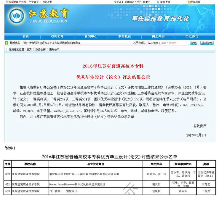 5月9日,根据《省教育厅办公室关于做好2016年普通高校本专科毕业设计(论文)评优与抽检工作的通知》(苏教办高〔2016〕7号)要求,在高校择优推荐基础上,经省普通高等公司本专科优秀毕业设计(论文)评选组织工作委员会组织专家评审,公司荣获三等奖2项,团队优秀毕业设计1项。