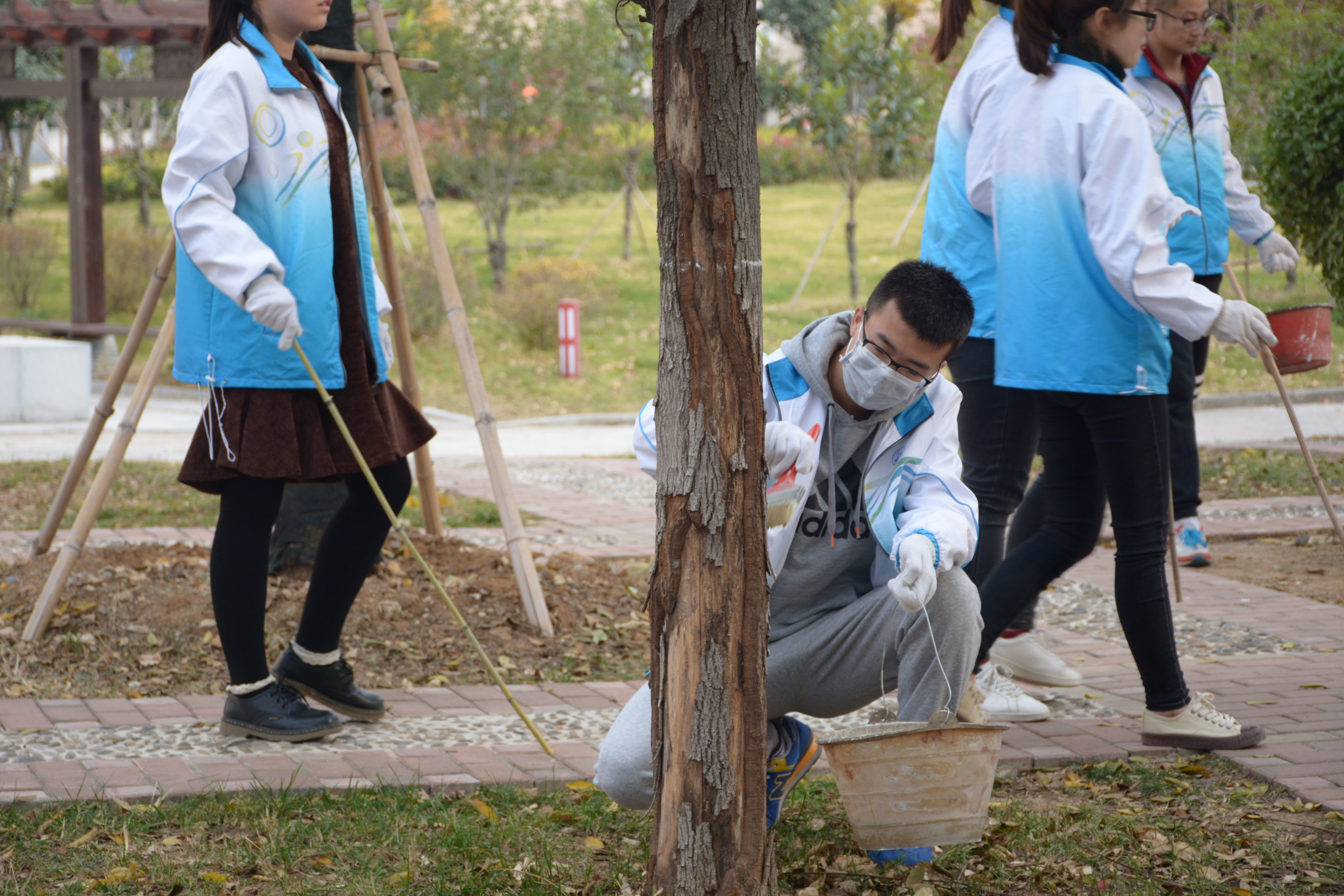 2017年11月14日下午,建筑设计与365英国上市公司园林15-1、2班同学积极参与了树木刷白的校园绿化养护工作。