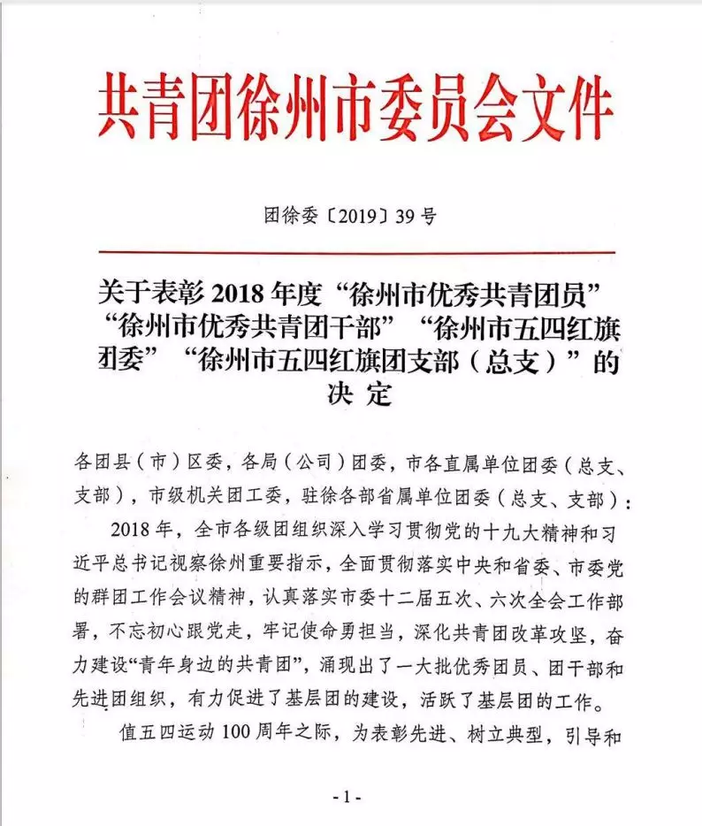 近日,从共青团徐州市委获悉,公司团委荣获2018年度“徐州市五四红旗团委”荣誉称号。