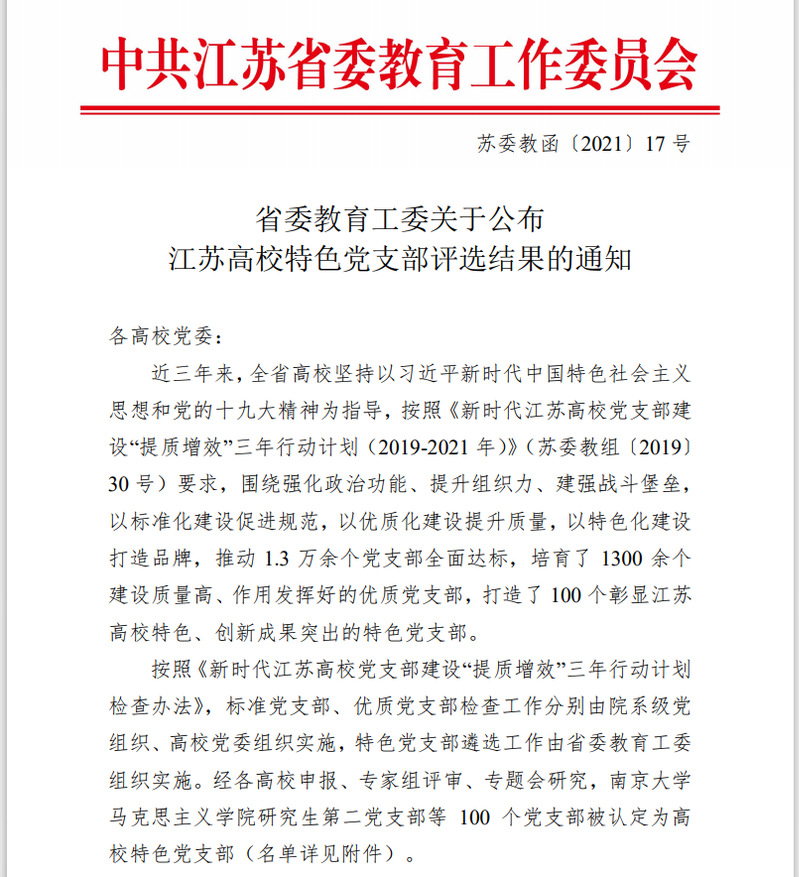 近日,江苏省委教育工委印发《关于公布江苏高校特色党支部评选结果的通知》(苏委教函〔2021〕17号),公司员工党支部被评为“江苏高校特色党支部”。