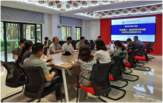 研讨会上,专业主任翟胜增对室内艺术专业“岗课赛证”融通课程体系构建进行了汇报,按照以岗定课、以赛提技、以证定标的课程体系构建思路,形成了全新的课程体系。教务处戚豹处长对此次室内艺术设计专业人才培养方案修订和“岗课赛证”融通课程体系构建给予了高度评价,并提出了相关要求。随后,企业专家和专业教师针对课程体系展开了热烈而深入的研讨,明确了课程对应的工作任务、技能要求和知识要求,对开展课程标准的编制打下了良好基础。最后,公司党总支书记娄志刚、副经理袁涛分别进行了总结,他们对室内艺术设计专业的人才培养方案及课程体系改革给予了充分肯定,希望室内设计专业坚持需求导向,持续改革,提高专业影响力。