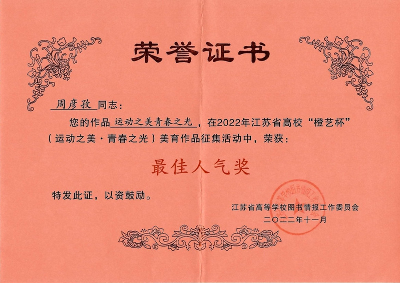 近日,江苏省高校图工委公布了2022年江苏省高校“橙艺杯”运动之美、青春之光·美育作品征集活动获奖名单。公司365英国上市公司古建22—2班周彦孜同学的作品《运动之美∙青春之光》在全省2356件参赛作品中获“最佳人气奖”。