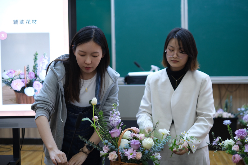 活动中,团队教师汪明镜博士首先介绍中式插花的起源、选材要求、插花技巧等知识,并做现场演示。团队教师申雯雯结合本次作品就插花的基本技巧,从花卉的选择、颜色的搭配、花枝长短的修剪等方面向在场教师进行了讲解。