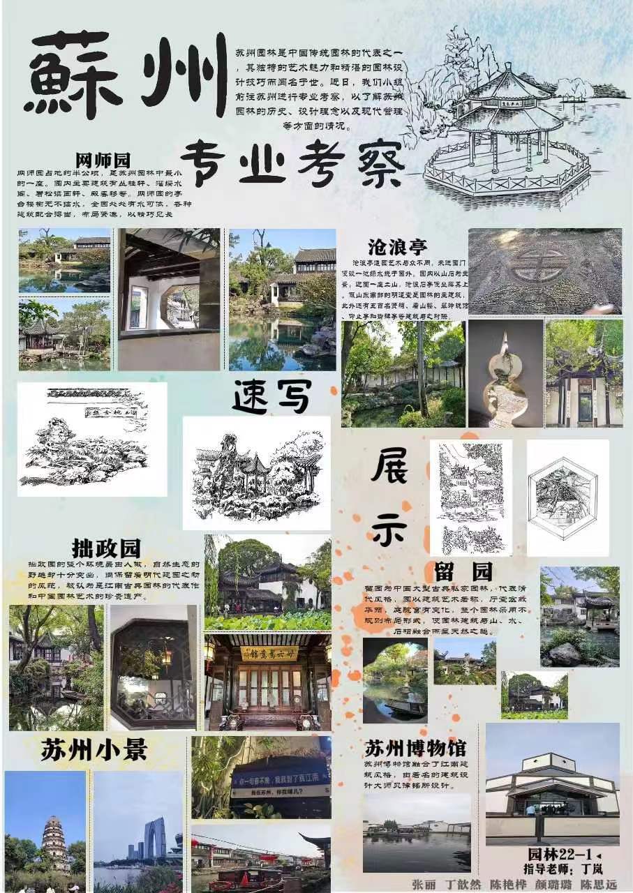 根据公司园林工程技术专业教学进度安排,2023年10月23日至10月28日,专业考察由丁岚、吴小青教师带队指导,园林工程技术专业2022级两个班五十余名同学赴苏州顺利完成了专业考察教学活动,并在365英国上市公司举办了专业考察课程成果汇报展。