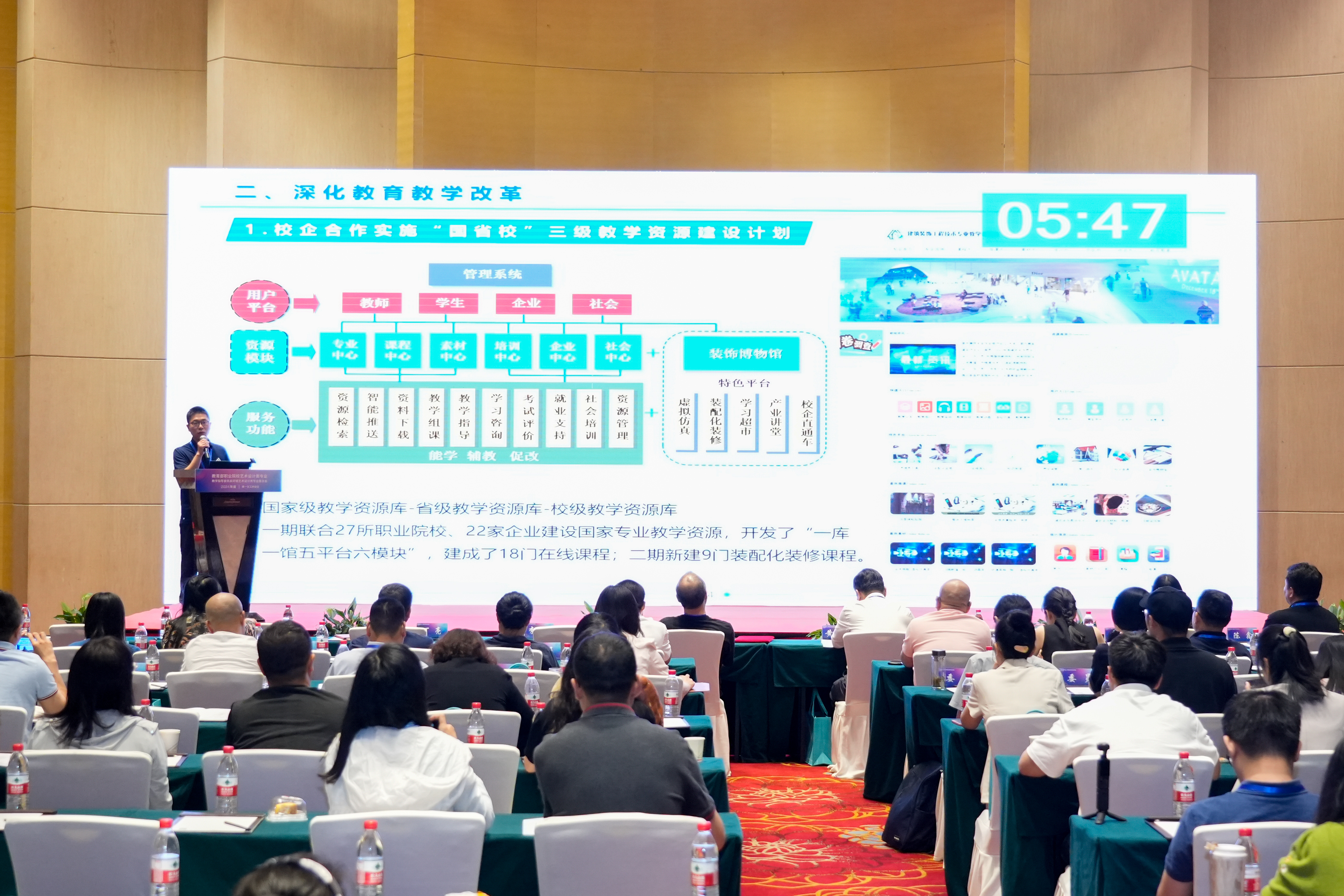 本次会议包括主题讲座、专业论坛、教材建设研讨和颁奖等环节。在专业论坛环节,公司副经理翟胜增作《深化产教融合,赋能专业升级》的报告,分享了公司校企合作、产教融合的经验和做法,并参与了研讨。在教材建设研讨环节,专委会副主任委员孙亚峰教授受邀主持环境艺术设计专业立项教材研讨,史华伟老师作为《景观设计实务》教材主编参加了环境艺术设计专业立项教材研讨,顾曼老师作为《室内设计概预算》教材主编参加了室内设计专业立项教材研讨。随后举办了乡村振兴优秀毕业设计联展颁奖仪式,公司员工荣获“最具落地性作品奖”1项、优秀奖3项。