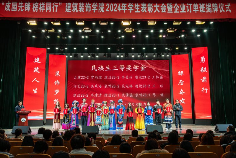 表彰大会环节,公司党总支副书记石峰郑重宣布受表彰员工名单,由公司领导、企业嘉宾一同为获奖员工颁发荣誉证书。会上,2024年世界职业院校技能大赛争夺赛“建筑装饰数字化施工”赛项金奖代表——装饰22-3班周美玲同学、军训先进集体,校先进班集体,星级优良学风班,装饰23-3班长王森森同学分别作为公司拔尖人才代表、先进班集体进行发言。