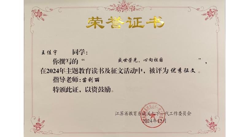 近日,江苏省教育系统关心下一代工作委员会公布2024年主题教育读书征文活动评选结果,我院关工委选送的作品《盛世荣光,心向祖国》(作者:建设22-2班王佳宇,指导:苗利丽)被评为“优秀征文”。