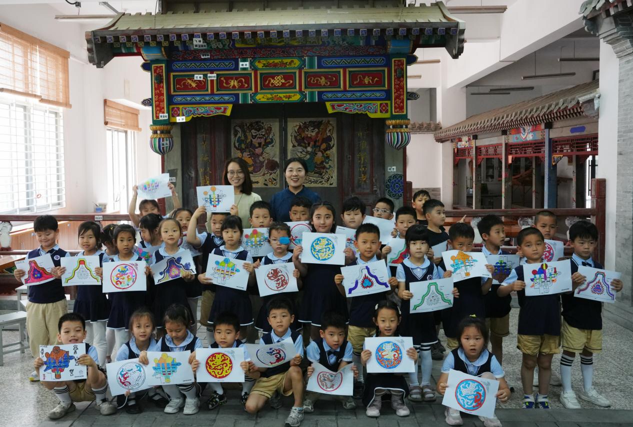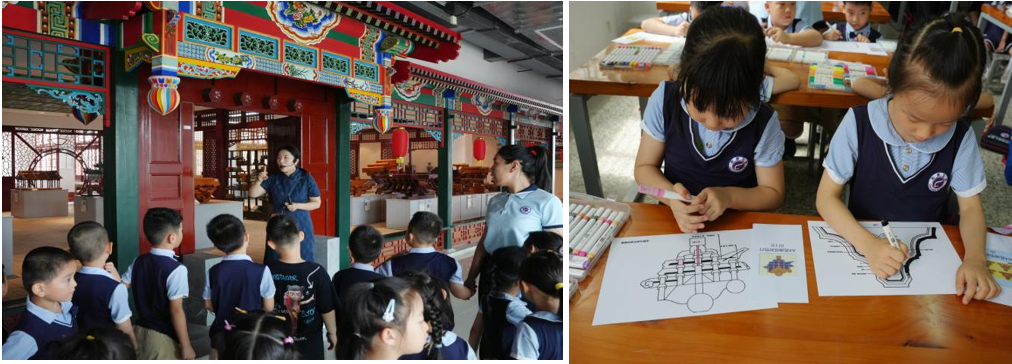 此次活动分为参观古今建筑模型区、古建筑技艺传承体验中心、古建筑彩画工作室和古建筑画作体验四个部分。参观体验过程中,于琍就木作、瓦石作、彩画作三部分进行讲解,同学们体会到中国古建筑从设计到建造,皆体现出古人的规矩制度。参观部分结束后,小同学们在古建师生的带领下,移步至技术馆一楼彩画工作室进行彩画作体验,由于琍老师进行彩画作指导,孩子们在临摹、上色中,充分实现古建筑工程技术与艺术的融合。