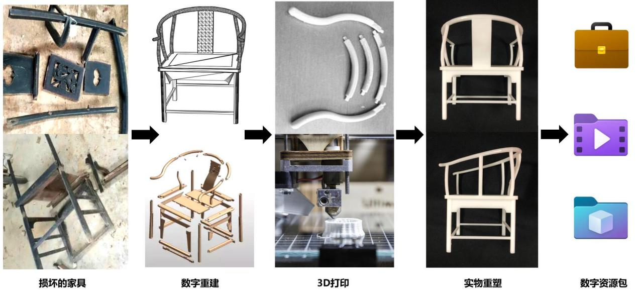 在前期信息采集的基础上,团队充分发挥专业特长,运用数字交互技术,对旧址进行数字复原与设计重构。针对现存旧址所面临的“地域文化传承、古建筑文化保护、红色革命文化弘扬”缺失问题。团队深度融合古建元素,精心打磨旧址整体布局,尤其针对木构建与装饰品中核心性与缺失性的装饰部位采用AutoCAD、3dMax、photoshop等数字软件与3D打印技术相融合进行数字重建与实物重塑,这样所形成专题性的数字资源包不仅为研究者提供了技术性的数据资料,同时激活沉睡的文化遗产,使之场地焕发古建新生,绽放红色文化魅力。