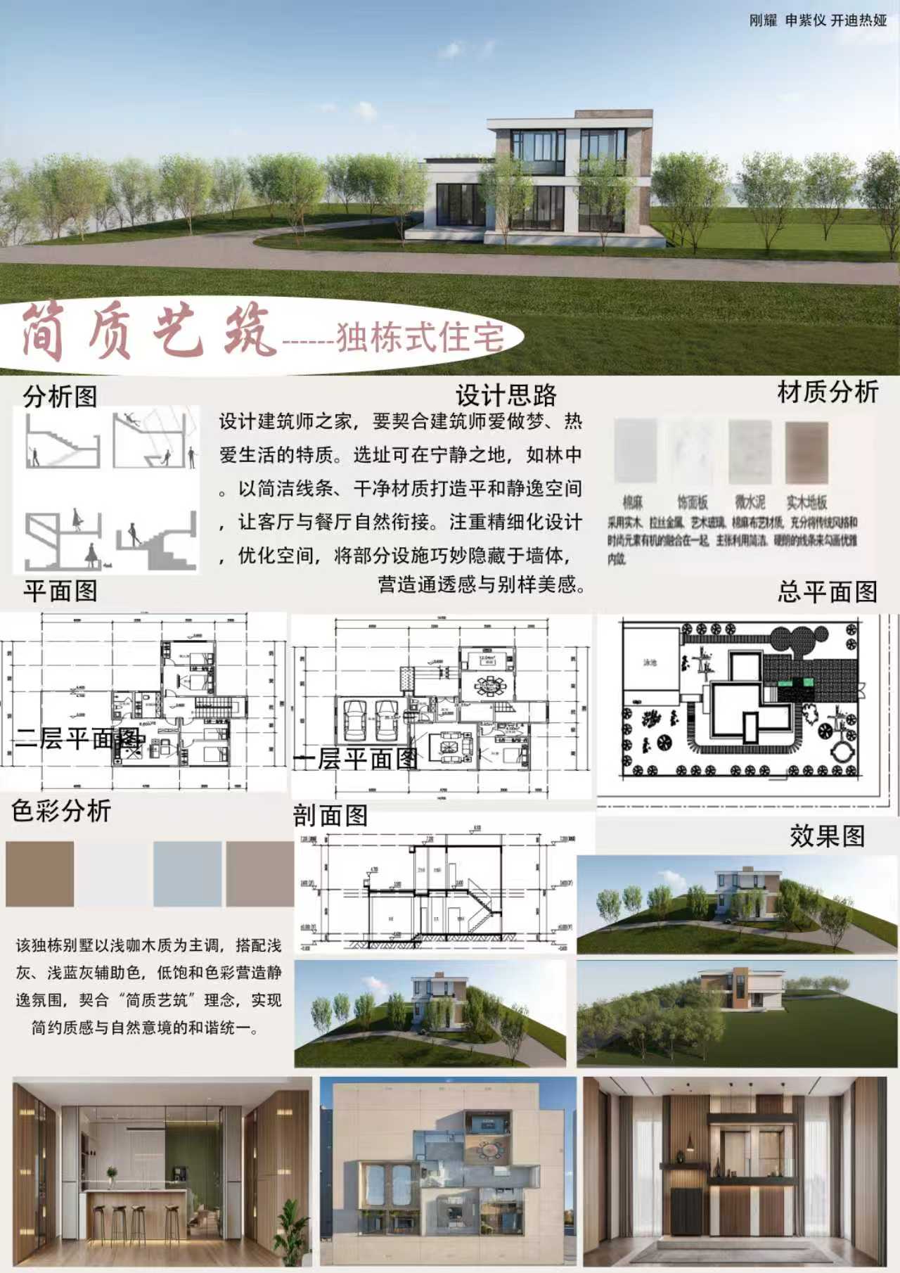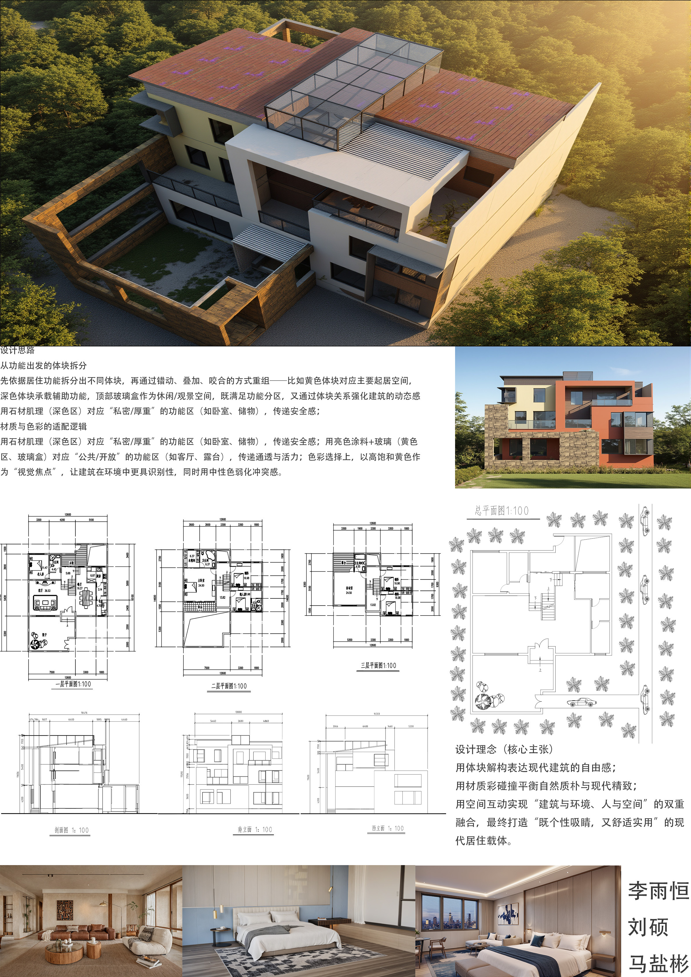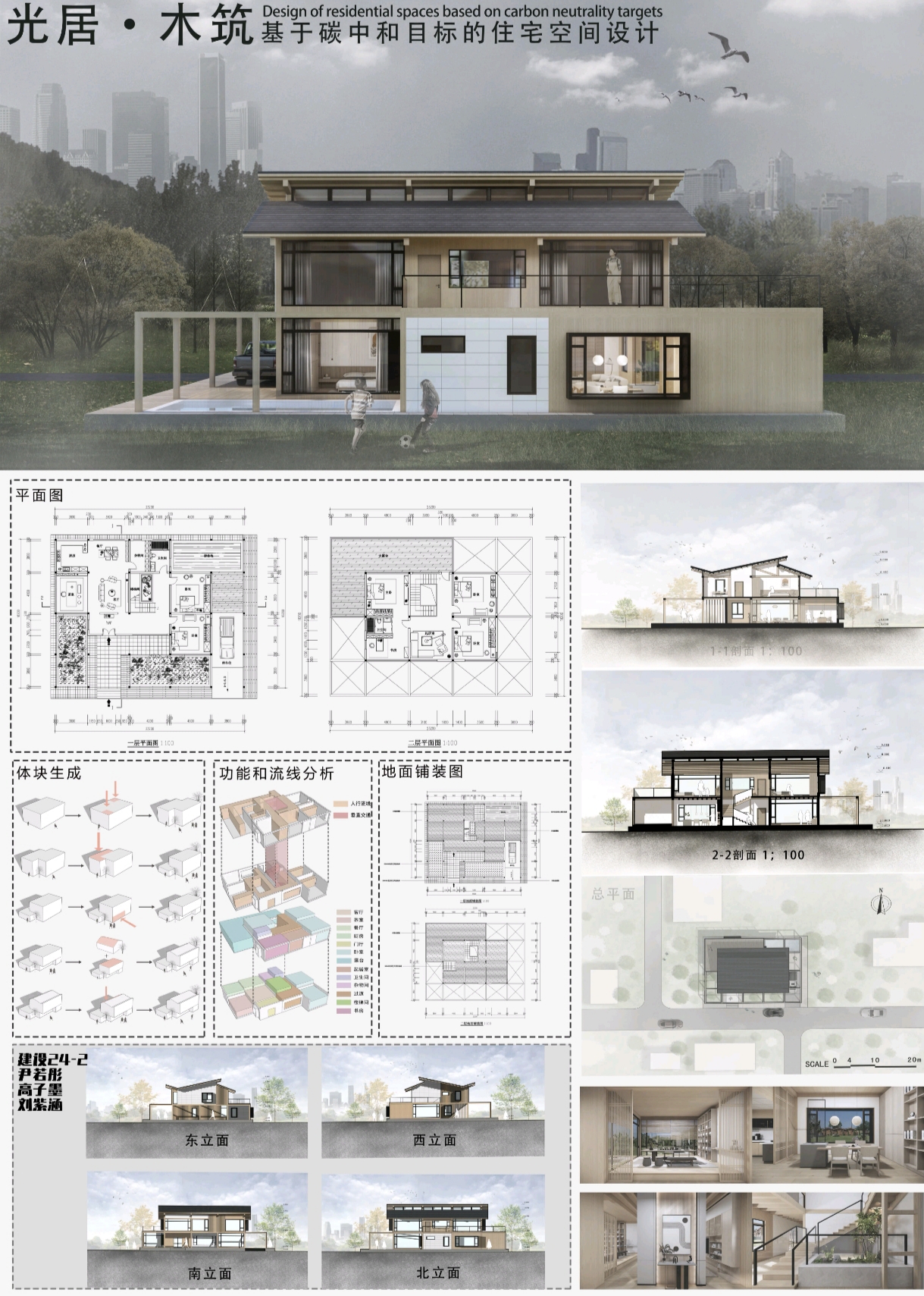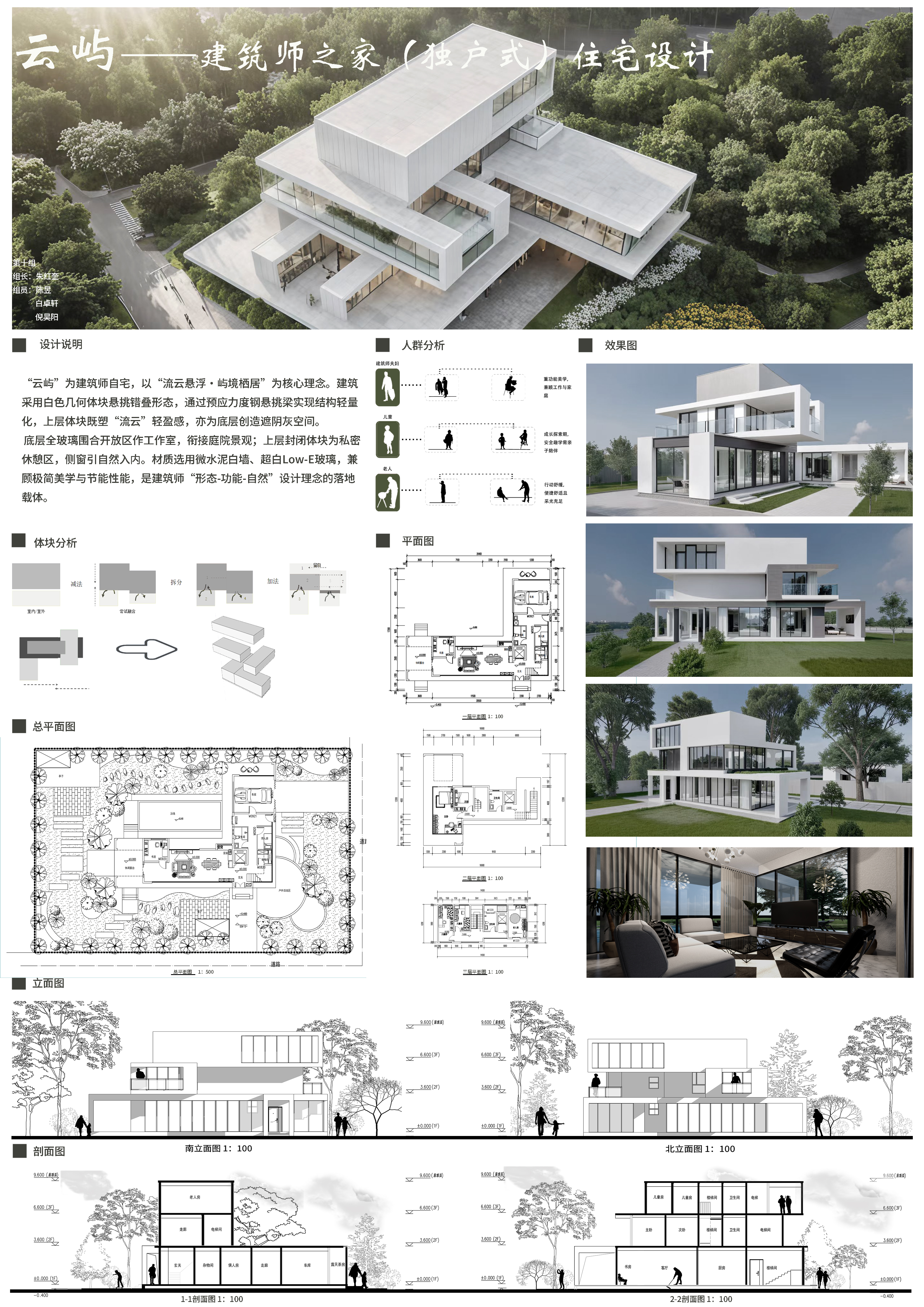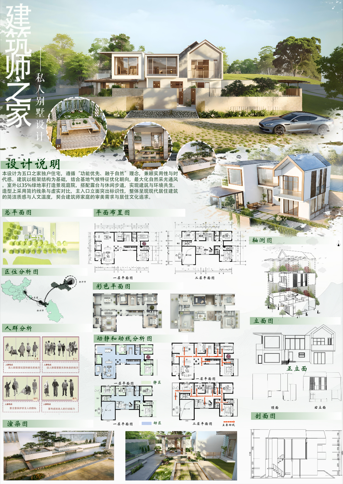 本次独立式小别墅设计是建设专业同学步入专业设计课程的第一个大作业。此次作业全年级有22组作品,从初始概念设计到AI辅助成图,各团队成员用不同的方式展示了180㎡的空间里“老-中-幼”三代人的生活模式。作品在注重功能的原则下关注形式的创新,同时更深入思考人与环境的共生关系,让建筑承载从‘功能容器’向‘情感载体’的功能转变。