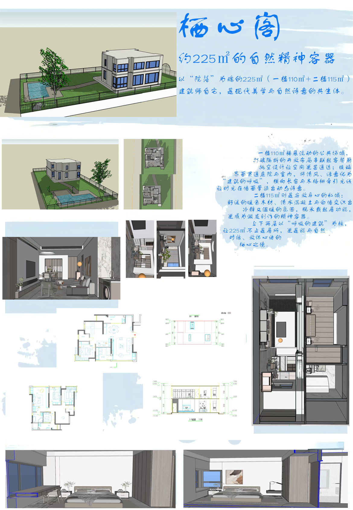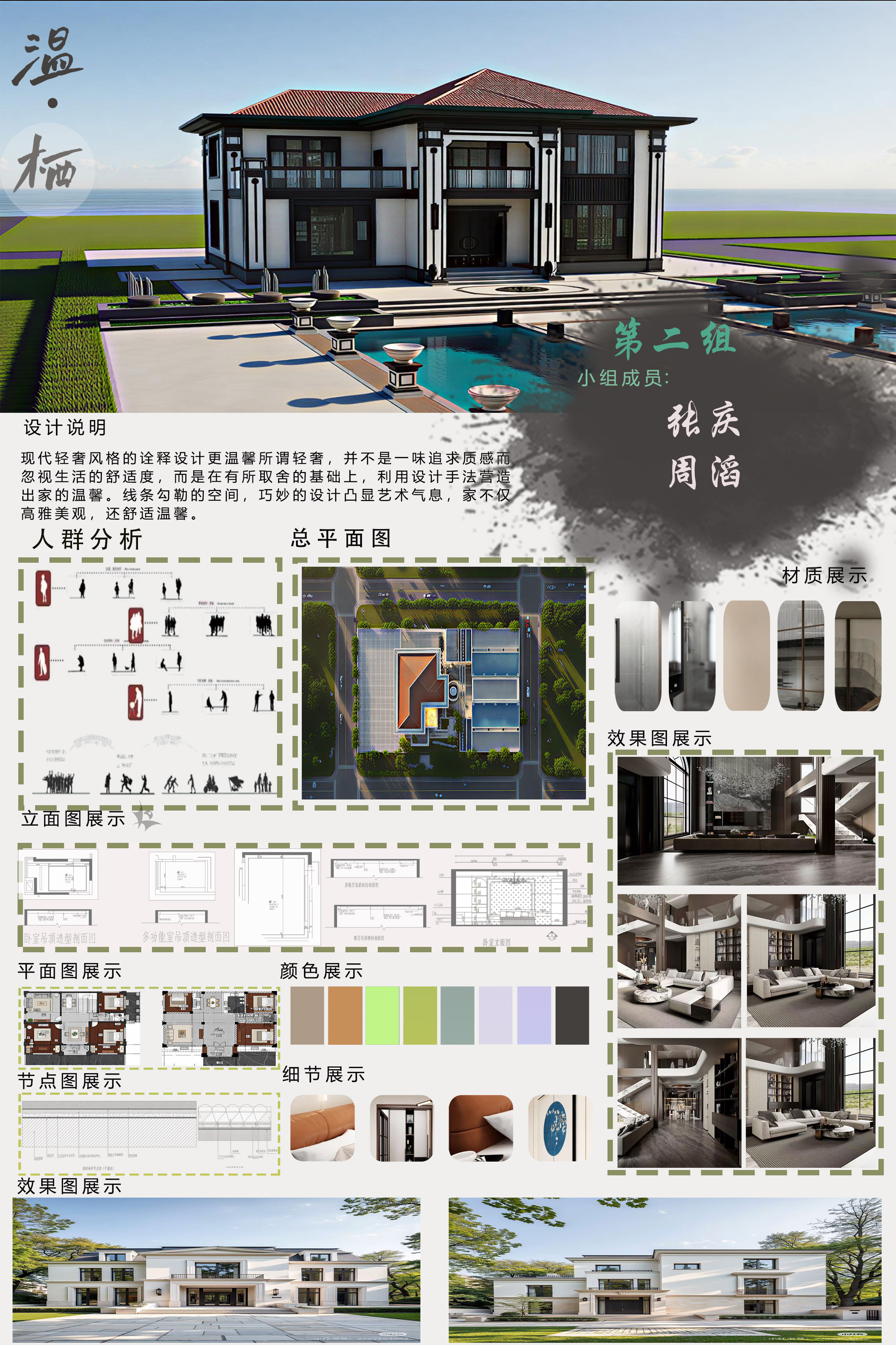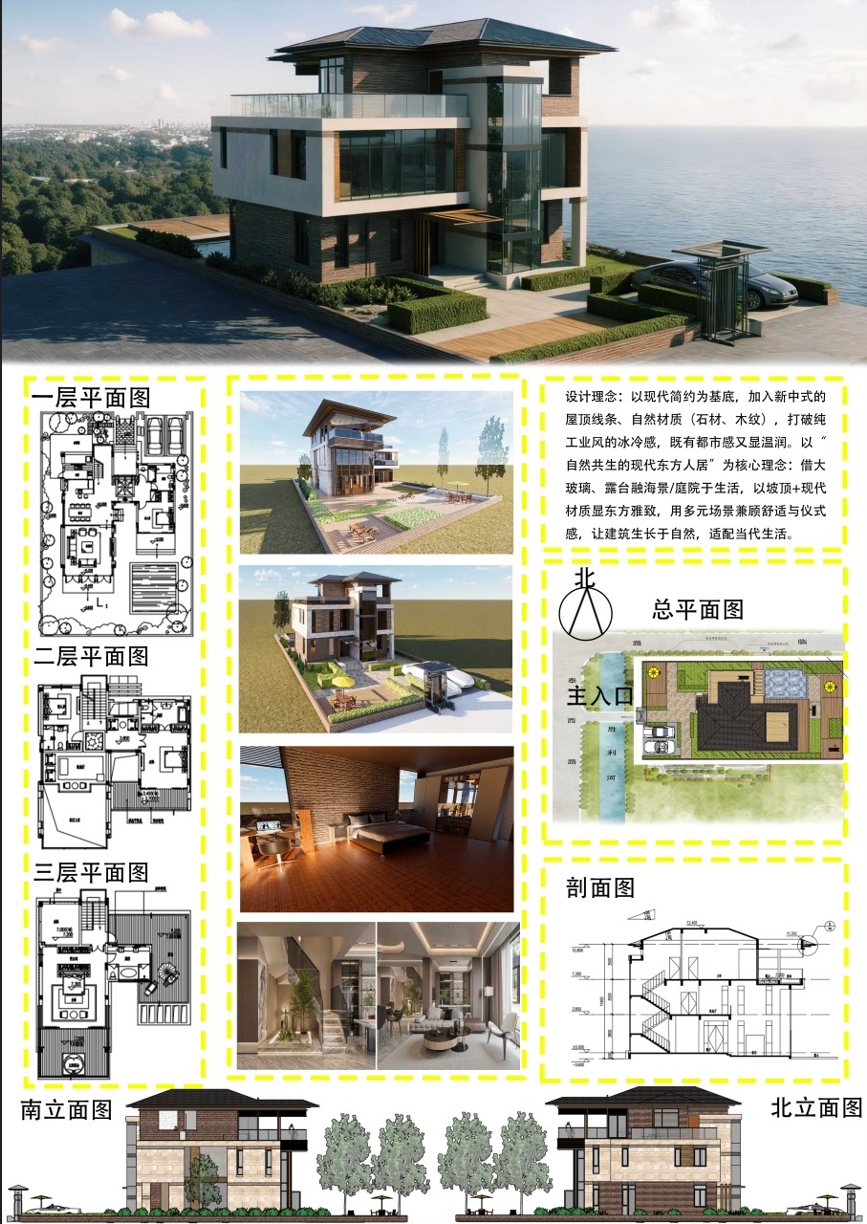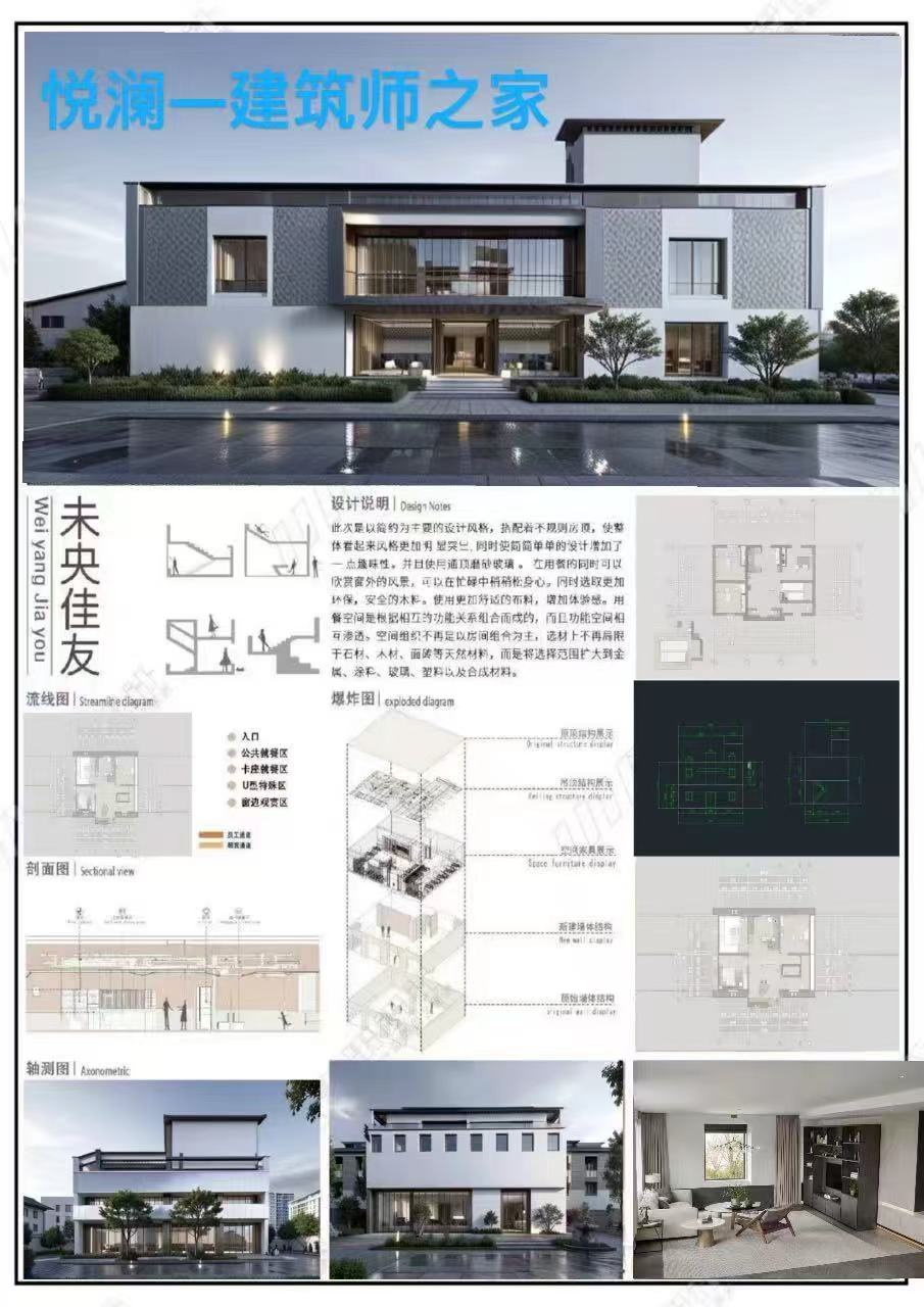 本次独立式小别墅设计是建设专业同学步入专业设计课程的第一个大作业。此次作业全年级有22组作品,从初始概念设计到AI辅助成图,各团队成员用不同的方式展示了180㎡的空间里“老-中-幼”三代人的生活模式。作品在注重功能的原则下关注形式的创新,同时更深入思考人与环境的共生关系,让建筑承载从‘功能容器’向‘情感载体’的功能转变。